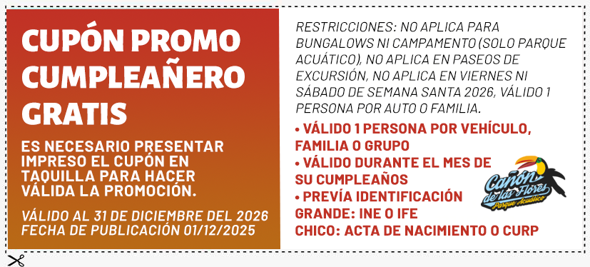 ESTA PROMOCIÓN NO APLICA CON: BUNGALOWS NI CAMPAMENTO (SOLO PARQUE ACUÁTICO), NO APLICA EN JUEVES 2X1, NO APLICA EN PASEOS DE EXCURSIÓN, NO APLICA EN VIERNES NI SÁBADO DE SEMANA SANTA 2024. VÁLIDO 1 PERSONA POR AUTO O FAMILIA.